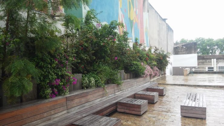 Era un patio que no se aprovechaba lo suficiente por parte del alumnado, docentes y funcionarios de la Institución. La Decana Susana Mayo nos encomendó la tarea de diseñar la plantación de distintas especies, poniendo énfasis en las Santa ritas (Bougainvillea sp.).